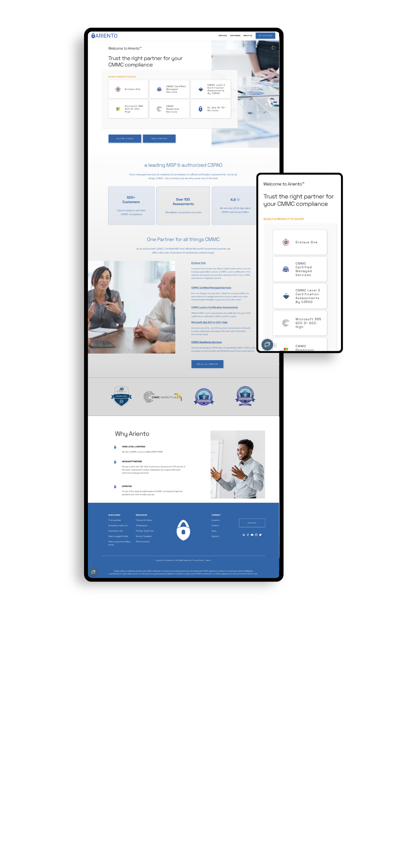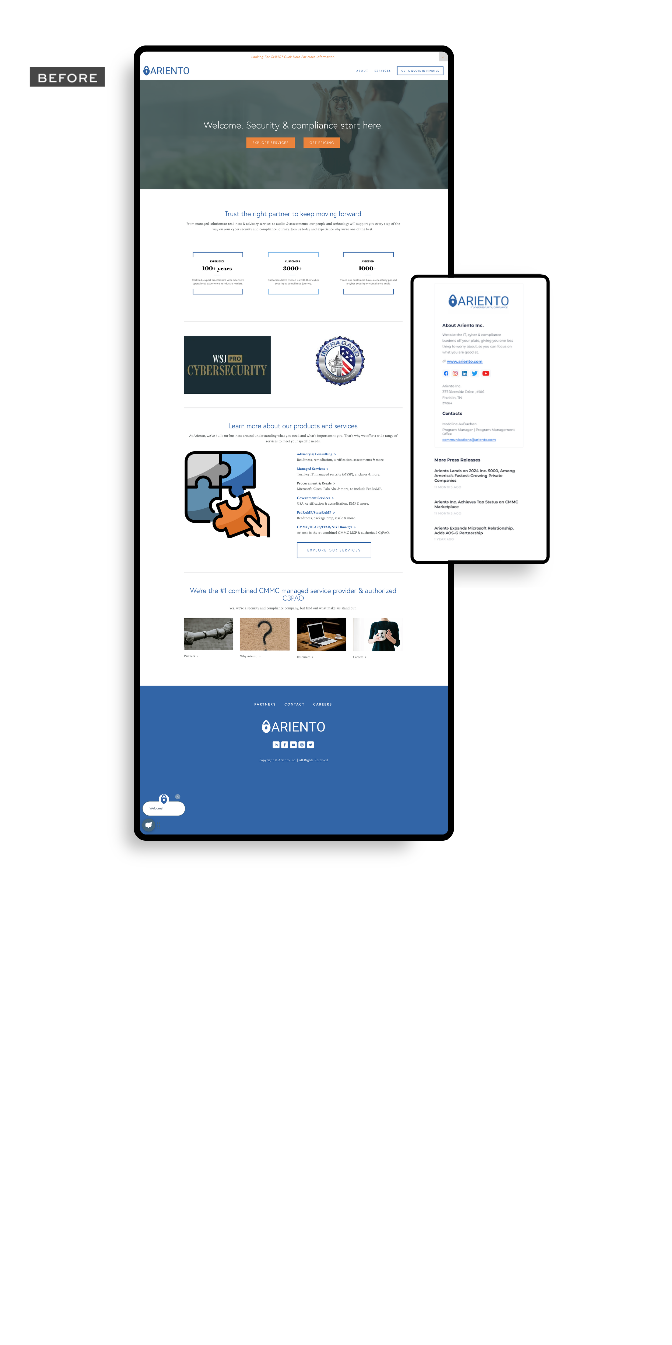 Ariento is a B2B cybersecurity, IT, and compliance provider serving highly regulated industries, including defense contractors and government-adjacent organizations. As the company expanded its service offering and entered a rapidly growing CMMC compliance market, the goal of this project was to modernize its digital presence while preserving existing brand recognition. Working within the constraints of a legacy Squarespace 7.0 site in Developer Mode, we developed a phased approach that balanced immediate business needs with long-term scalability, ensuring critical updates could be launched on time while planning for a more robust rebuild on a future-proof platform.