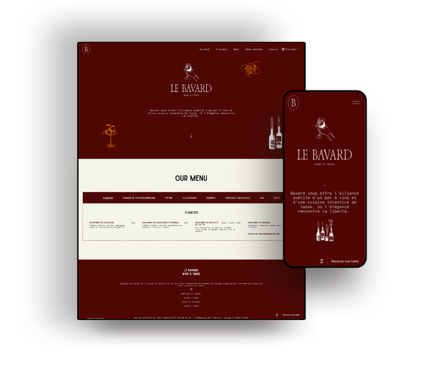 The project also involved SEO optimization to ensure that the restaurant appeared prominently in search results and helped attract a steady flow of new clients. Additionally, we assisted with the creation of various digital and printed assets, including menu designs. The collaboration with Le Bavard was smooth and exciting, and we truly enjoyed translating their vision into a polished and professional online presence that aligns with their brand values of warmth, good taste, and social connection.