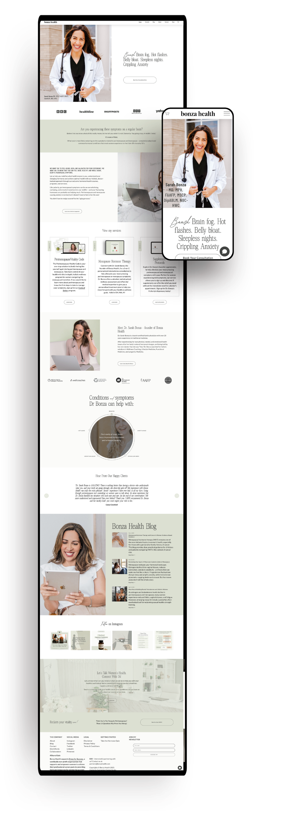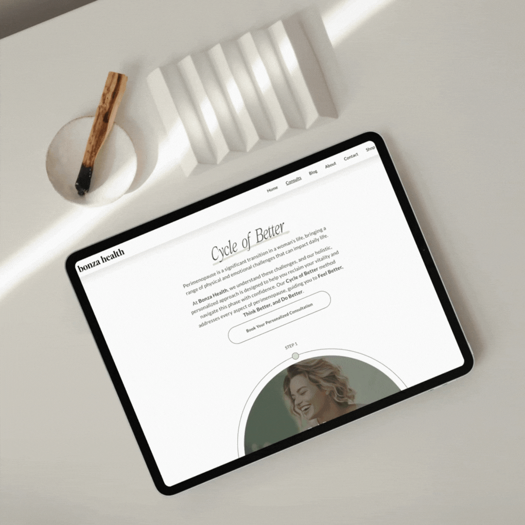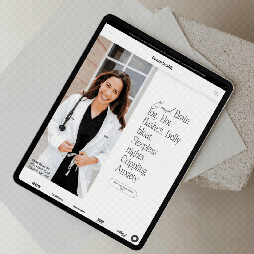 Bonza Health is a online medical practice founded by Dr. Sarah Bonza, a board-certified family physician who pivoted from traditional medicine to a more holistic, hormone-focused approach after navigating her own health transformation during perimenopause. When Dr. Bonza came to us, she envisioned more than a website—she wanted to build a community, a source of truth, and a place where women in their 30s to 50s could finally feel heard, seen, and supported. Together, we created a brand and online presence that balances clinical authority with deep compassion and clarity.