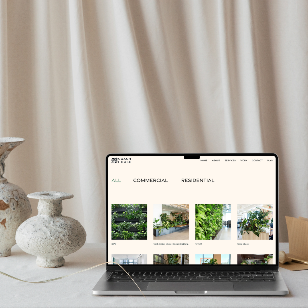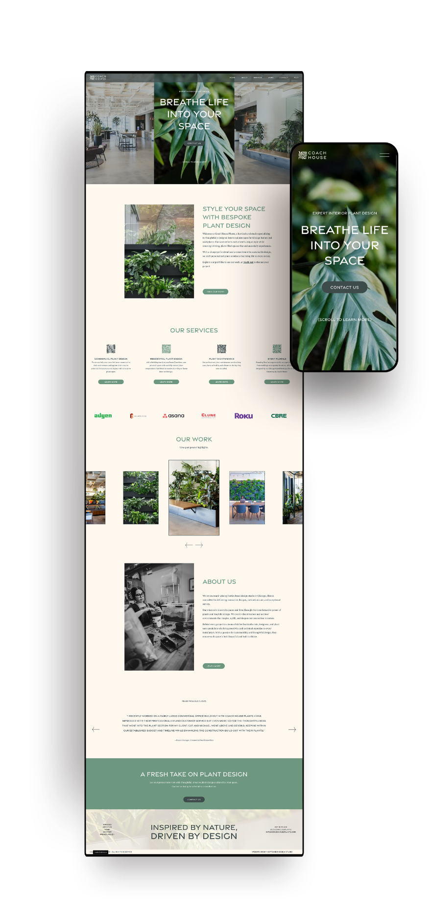 Coach House Plants, a boutique plant design studio in Chicago, partnered with us to elevate their website and refine their online presence, ensuring their digital home reflected the high-end, design-forward nature of their services. While their branding was already established, they needed a website that seamlessly integrated their identity while improving user experience, site structure, and content clarity.