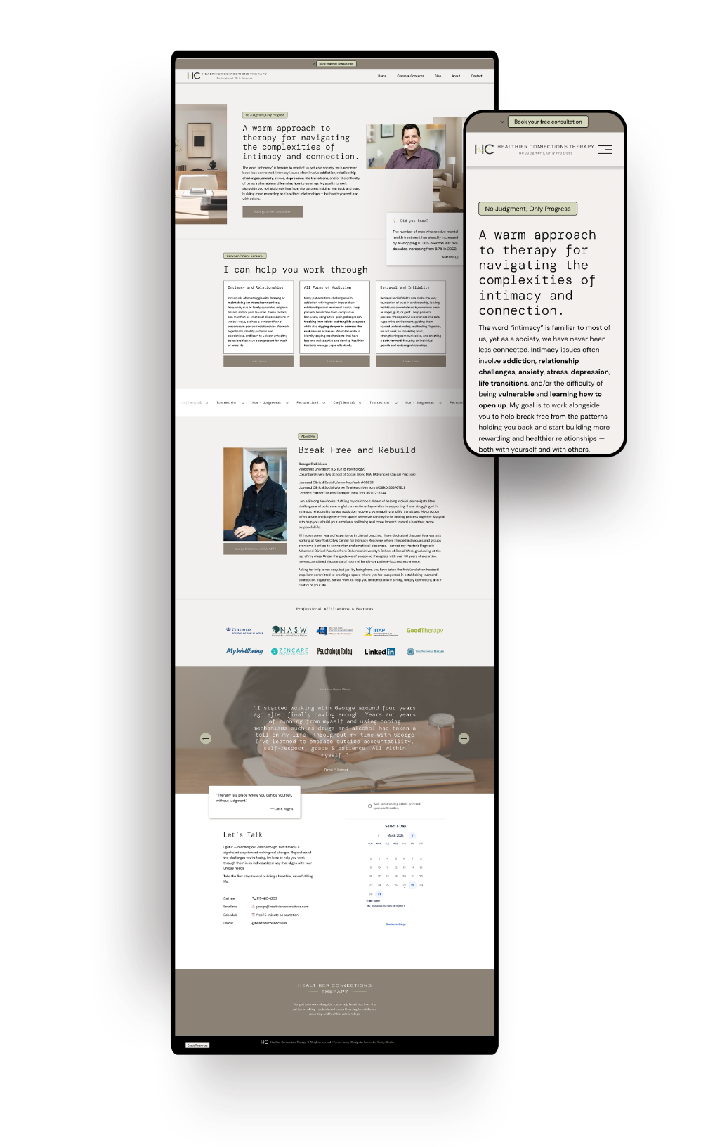 Healthier Connections Therapy is a New York City–based therapy practice founded by George Embiricos, LCSW, CPTT, specializing in intimacy challenges, addiction recovery, and emotional growth. George reached out to September Design Studio to elevate his online presence with a brand and website that would resonate with first-time therapy clients, particularly men navigating emotional and relational challenges.