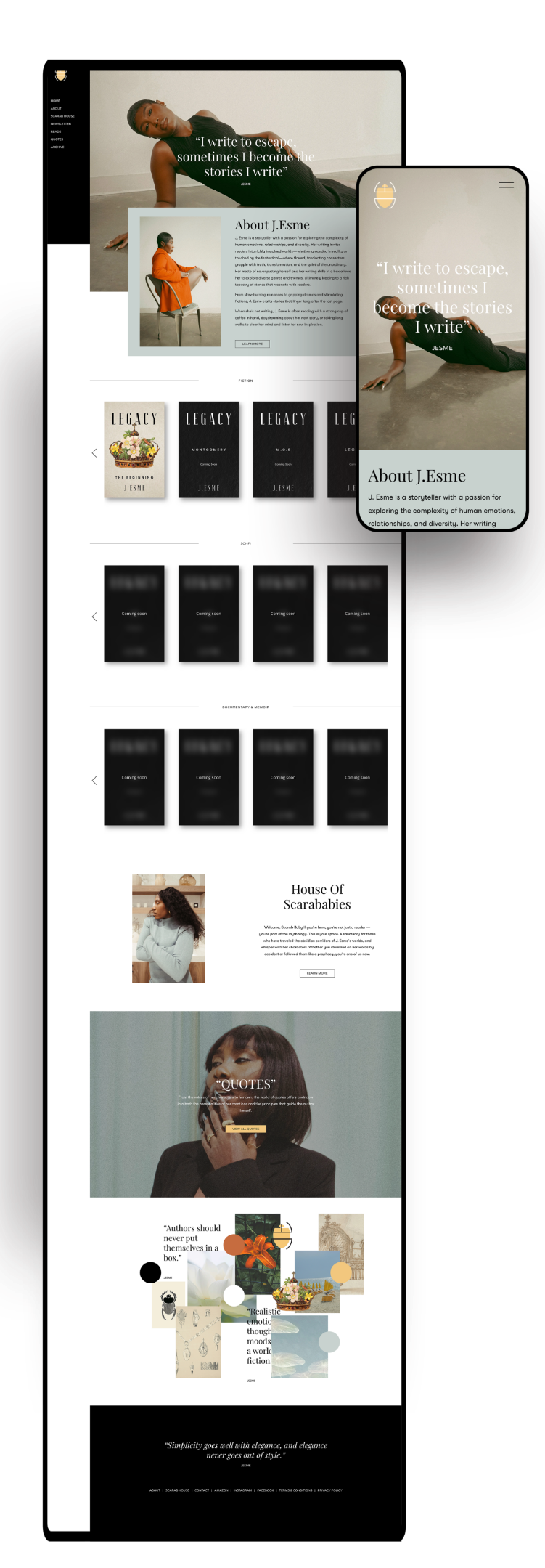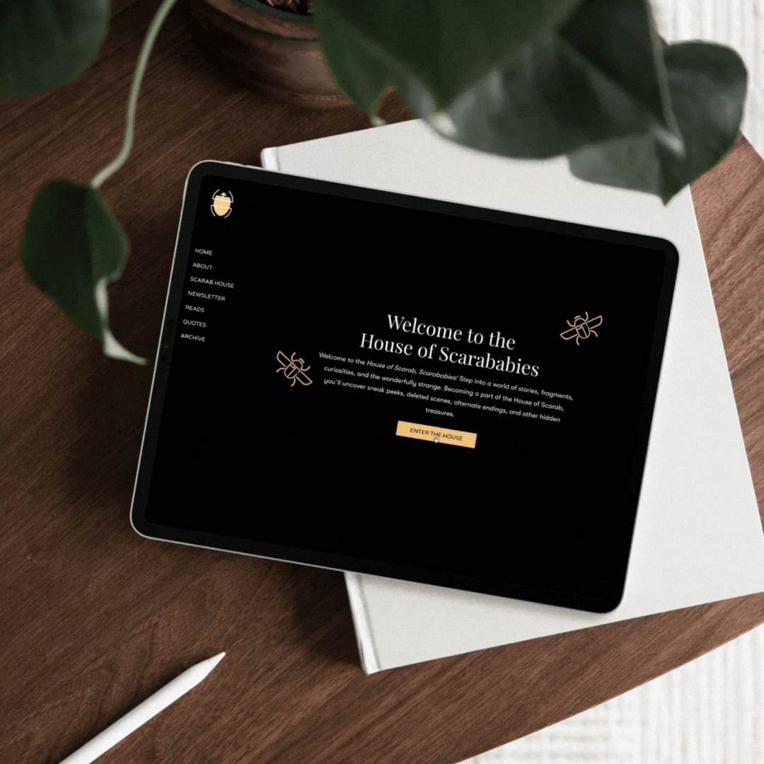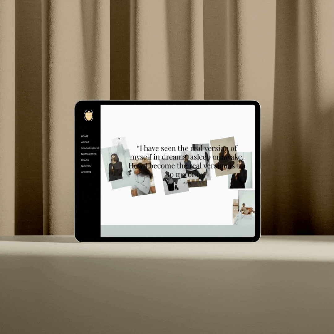 From the Reads and Archive sections to the immersive Scarab House experience, every page was crafted to tell a story — of legacy, transformation, and art in motion. The result is a seamless digital experience that mirrors Esme’s literary identity: layered, expressive, and unforgettable.