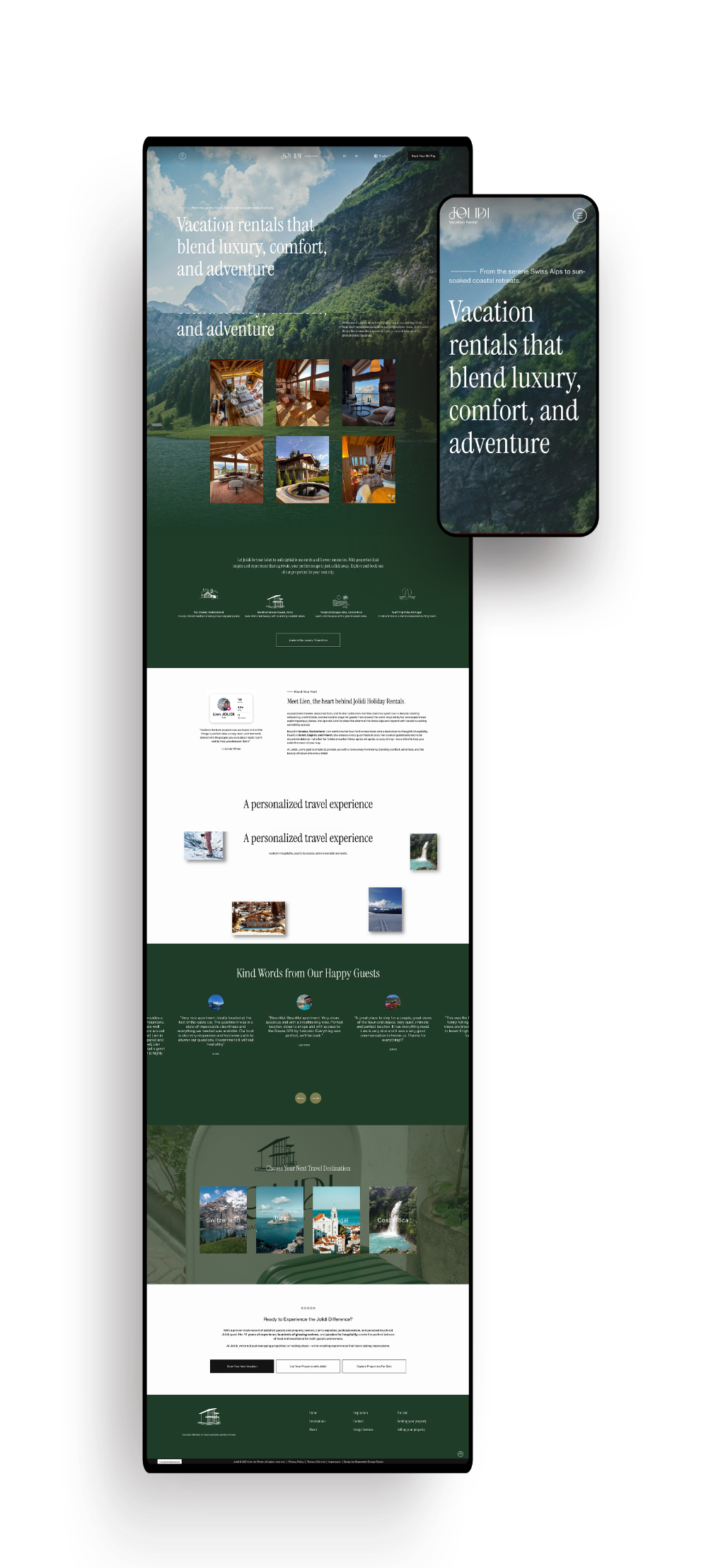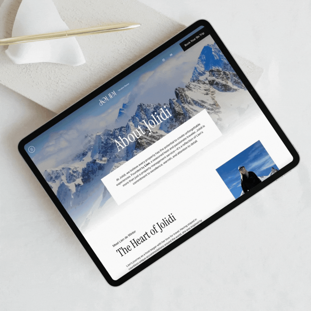 Jolidi is a boutique vacation rental brand offering carefully curated stays across Switzerland, Ibiza, and Costa Rica. The client, Lien de Winter, approached us to elevate her brand presence with a refreshed identity, cohesive storytelling, and a custom Squarespace website that could grow alongside her expanding portfolio of properties. Working closely with Lien, we developed a brand strategy that reflected Jolidi’s adventurous spirit and international appeal. From refining her brand voice to crafting SEO-optimized copy in both English and French, every detail was considered to speak to both travelers and potential property owners.