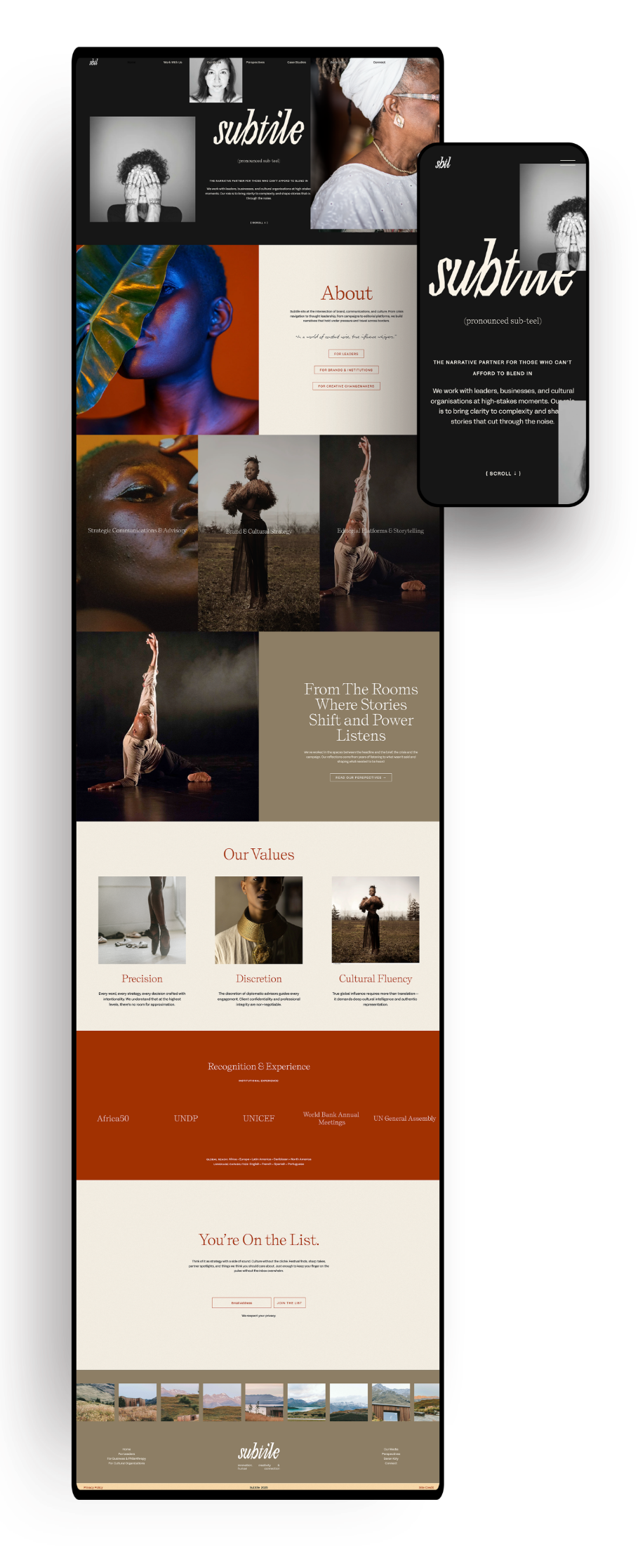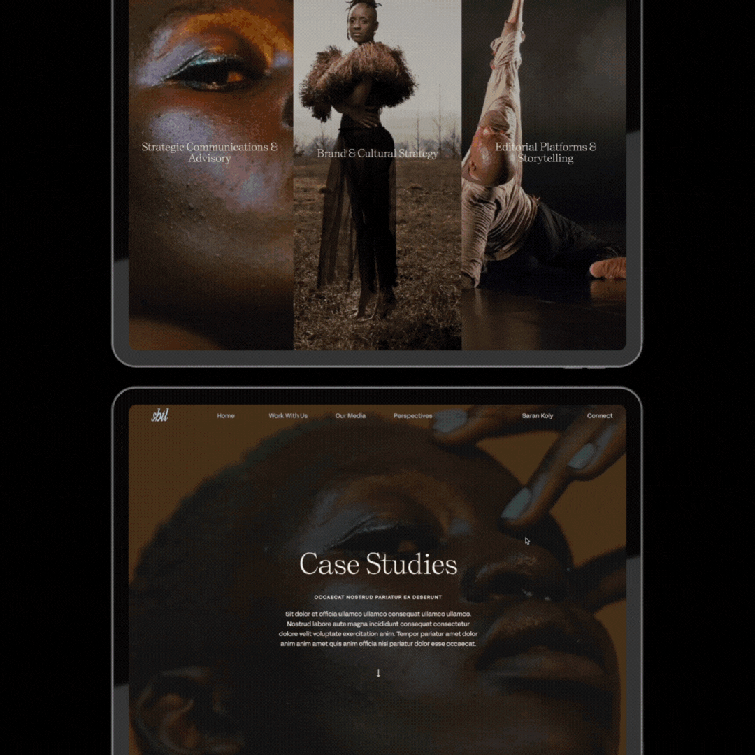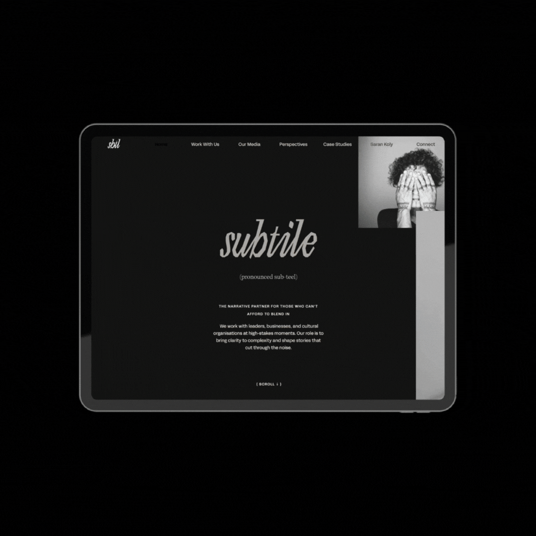 The website design, built on Squarespace, balances sophistication with clarity, featuring layered visuals, custom animations, and carefully structured content to highlight Subtile’s diverse body of work across the arts, nonprofit, and private sectors. Each section was designed to evolve with Saran’s growing portfolio while reflecting the depth and intentionality of her creative direction.