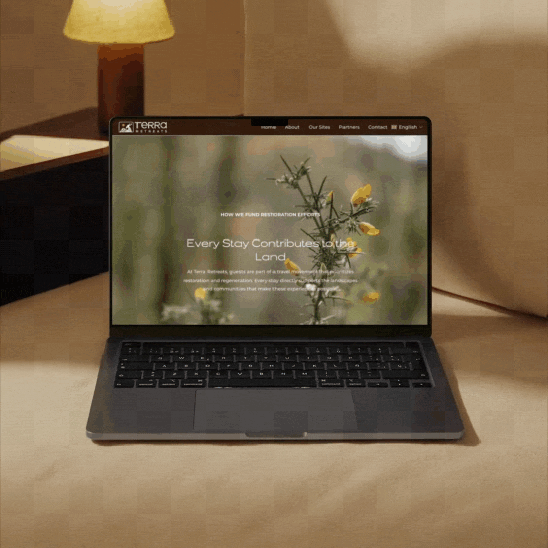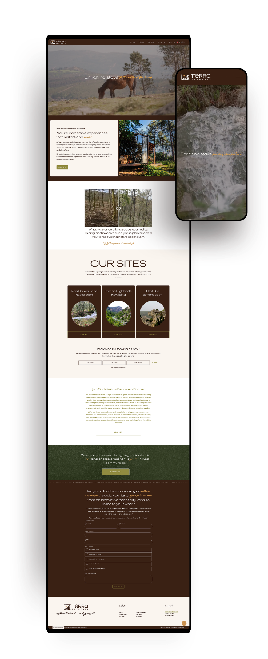 Terra Retreats is a new hospitality venture redefining eco-tourism in Spain by building small landscape resorts in areas undergoing active restoration. Our objective was to build a holistic brand and digital presence that could speak to two distinct audiences: eco-conscious travelers and early-stage investors or landowners aligned with Terra’s mission. The brand needed to feel elevated yet grounded—premium, but never performative; immersive, but never overly curated.